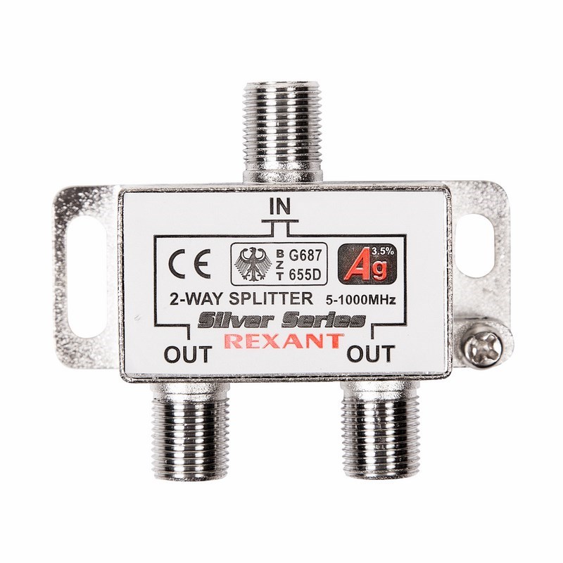 Телевизионный делитель предназначен для телевизионных систем и используется в домах и квартирах, где требуется подключить несколько телевизоров к одной антенне. Этот делитель распределяет поступающий на вход сигнал поровну на его выходы, что обеспечивает одинаково четкое изображение на всех подключенных устройствах. Делитель Rexant имеет два выхода для сигнала и подключается с помощью стандартных F-разъемов. Делитель комплектуется необходимыми F-разъемами, что позволяет удобно и быстро монтировать телевизионный кабель и подключать аппаратуру. Пайка внутри делителя осуществляется с использованием золотосодержащего припоя, что позволяет получить сигнал высокого качества и увеличить надежность. Данный делитель подходит для сигналов с частотой 5-1000 МГц, что соответствует стандартному эфирному телевидению.