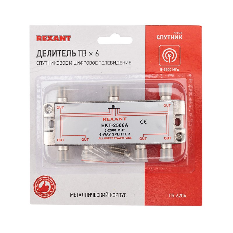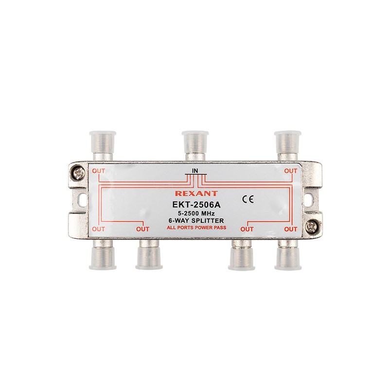 Телевизионный делитель это удобное средство для разделения сигнала на несколько равных частей. Антенные делители ,также называемые телевизионные сплиттеры часто используются, когда требуется подключить один телевизионный кабель, идущий от антенны, сразу к нескольким телевизорам или ресиверам. Особенно это актуально в многокомнатных квартирах или многокомнатных загородных домах. Делитель имеет один вход под F разъем и шесть выходов, также под F разъемы. Сигнал, подающийся на вход делителя, делится на две равные части и передается на выходы. Для подключения кабелей используются стандартные F-разъемы. Полоса пропускания делителя от 5 до 2500МГц позволяет использовать его в системах спутникового телевидения. Качественно изготовленный ТВ сплиттер REXANT долго и надежно прослужит в составе телевизионной системы, делая удобной эксплуатацию нескольких телевизоров.