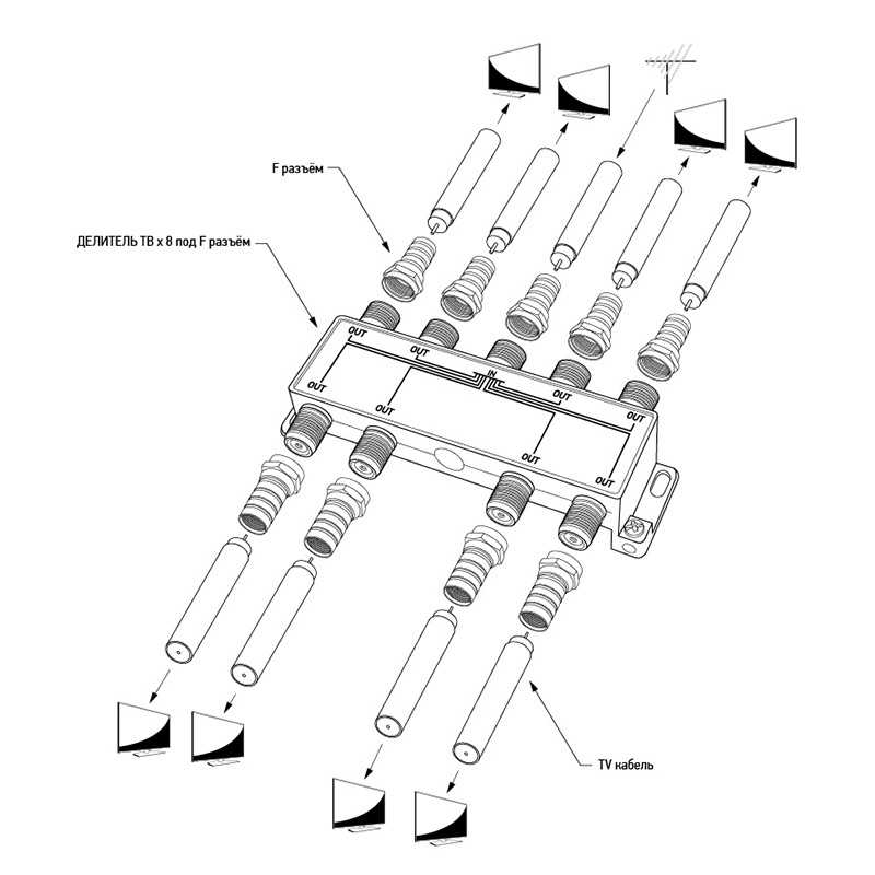 Телевизионный делитель предназначен для телевизионных систем и используется в домах и квартирах, где требуется подключить несколько телевизоров к одной антенне. Этот делитель распределяет поступающий на вход сигнал поровну на его выходы, что обеспечивает одинаково четкое изображение на всех подключенных устройствах. Делитель REXANT имеет восемь выходов для сигнала и подключается с помощью стандартных F-разъемов. Делитель комплектуется необходимыми F-разъемами, что позволяет удобно и быстро монтировать телевизионный кабель и подключать аппаратуру. Пайка внутри делителя осуществляется с использованием золотосодержащего припоя, что позволяет получить сигнал высокого качества и увеличить надежность. Данный делитель подходит для сигналов с частотой 5-1000 МГц, что соответствует стандартному эфирному телевидению.