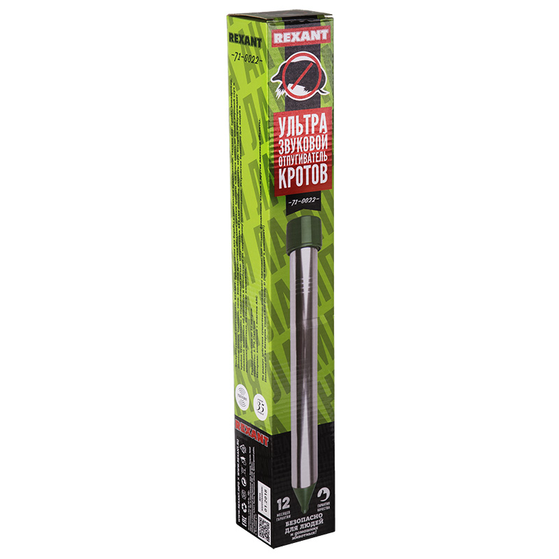 Ультразвуковой отпугиватель REXANT предназначен для борьбы с земляными вредителями, такими как: кроты, землеройки, полевые мыши, медведки, змеи. Земляные вредители обладают низким зрением или вовсе слепы, но имеют хороший слух и крайне чувствительны к определенным типам вибрации почвы. Отпугиватель REXANT способен создавать вибрацию, которая предупреждает земляных животных об опасности и способствует их скорейшему исчезновению. Устройство безопасно для людей и домашних животных, не содержит химикатов.