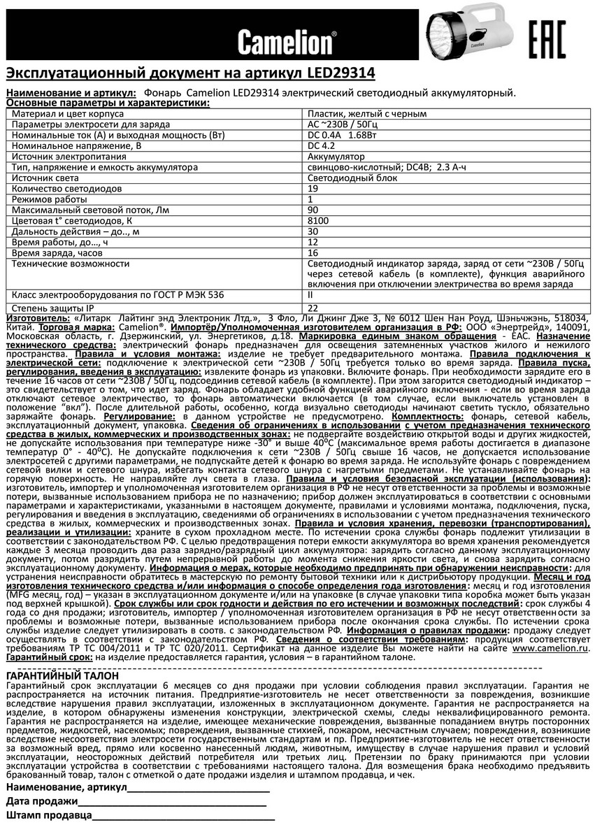 Аккумуляторный фонарь Camelion LED29314, 10471 имеет профессиональное назначение, и применяется в работе специальных служб - ремонтные бригады, МЧС и т.д., для работы в условиях плохой освещенности, или любителями активного отдыха - на рыбалке или в туристическом походе. Прибор способен работать до 12 часов без дополнительной подзарядки аккумулятора. Заряжается от сети в 220В. Емкий свинцово-кислотный аккумулятор обеспечивает низкий коэффициент саморазряда.