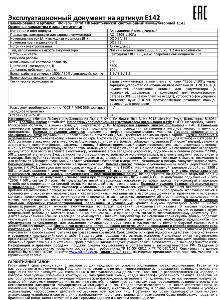 Применяемые элементы питания: Литий — ионный аккумулятор типа 18650 3.7 вольт 1200 мА-ч, допускается применение батареек 3 x AAA