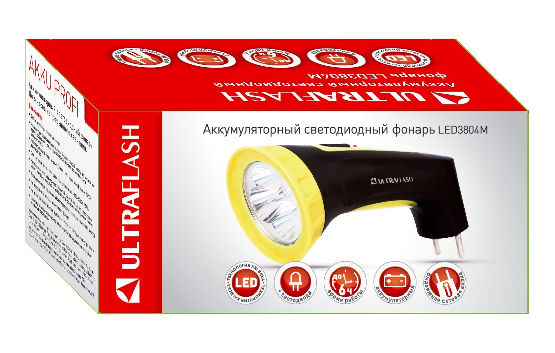 Тех.хар-ки, дополнительные функции: Дистанция освещения — до 20 м, 1 режим работы, время работы — до 6 часов, выдвижная сетевая вилка, IP20