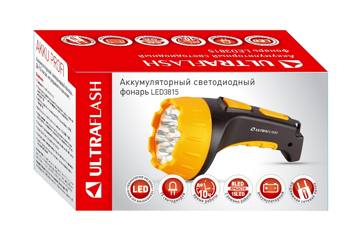 Фонарь "Ultraflash" LED3815 аккумуляторный IP22 (15 LED, 2 аккумулятора 4 вольт 0,5 А*ч/0,7 А*ч , дистанция освещения - до 30 м, время работы до 10 ч.)