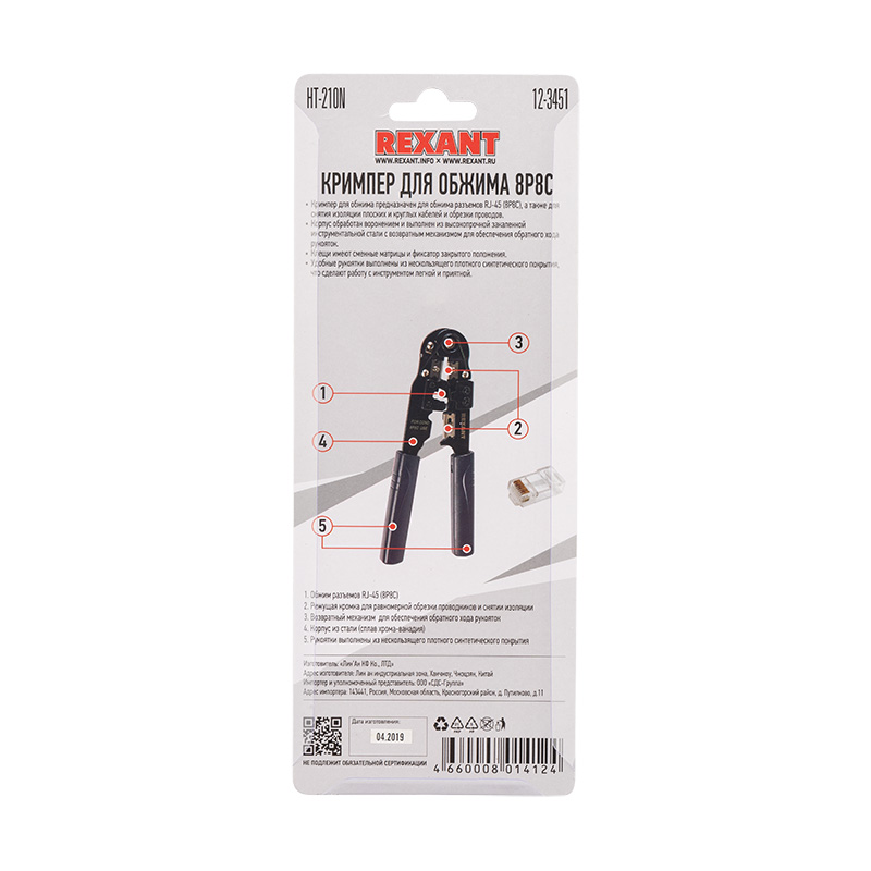 Кримпер REXANT HT-210N — универсальный инструмент для обжима разъемов RJ-45 (8P8C), а также для снятия изоляции и обрезки проводов.