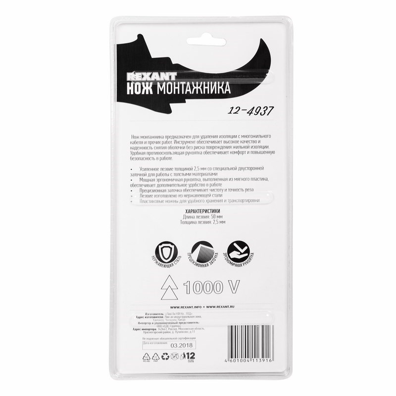 Нож монтажника нержавеющая сталь изогнутое лезвие Rexant