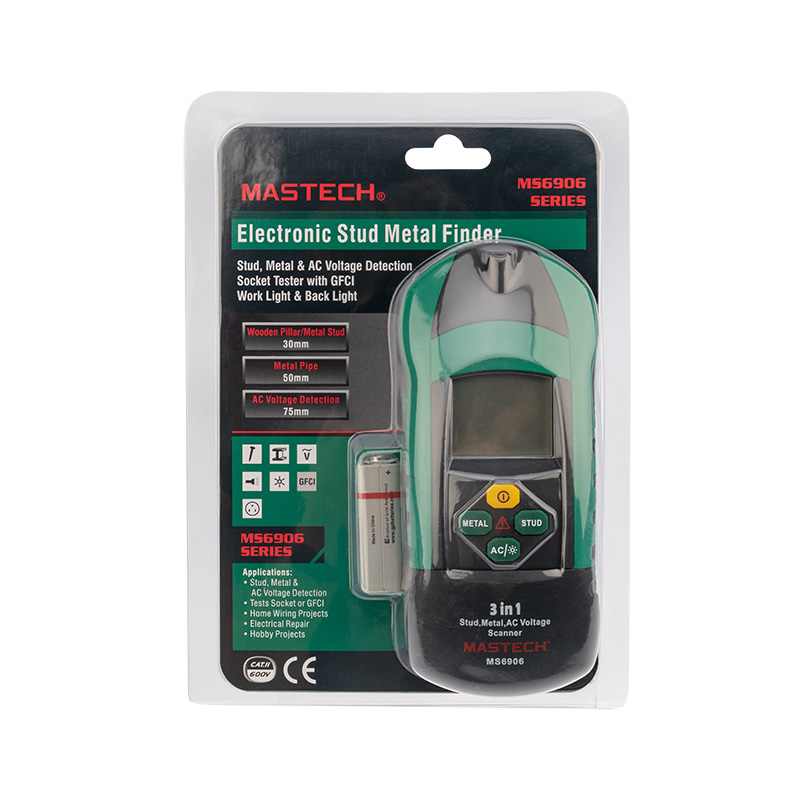 MASTECH MS 6906 — это многофункциональный прибор, включающий в себя большой набор возможностей. Предназначен для поиска металла, переменного напряжения, а также скрытых конструкций. С его помощью вы сможете обнаружить винты, гвозди, саморезы, шпильки, иголки и другие металлические предметы на глубине до 30 мм, металлические трубы на глубине до 60 мм и напряжение на глубине до 75 мм. Результаты поиска отражаются на дисплее прибора и обозначаются с помощью звукового сигнала.