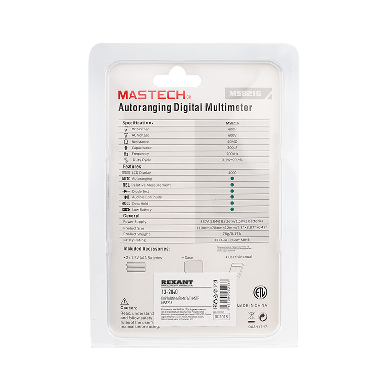 Стандартные аксессуары: щупы, батарея, инструкция