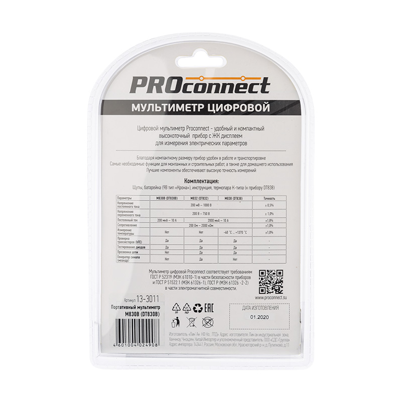 Мультиметр "PROconnect" М830В (DT-830) портативный (для измерения напряжения, постоянного тока и сопротивления в цепи, тестирования диодов)