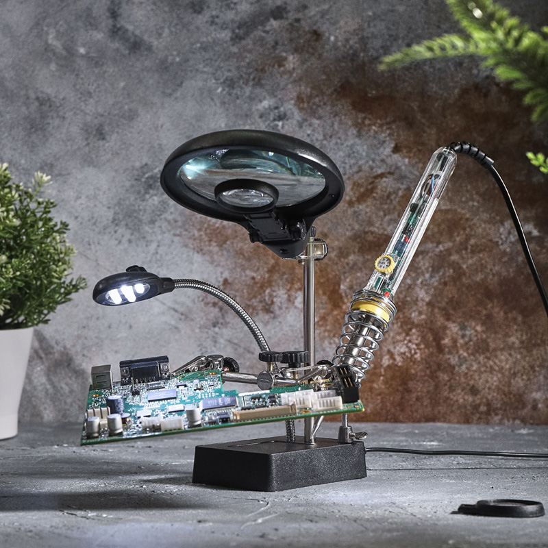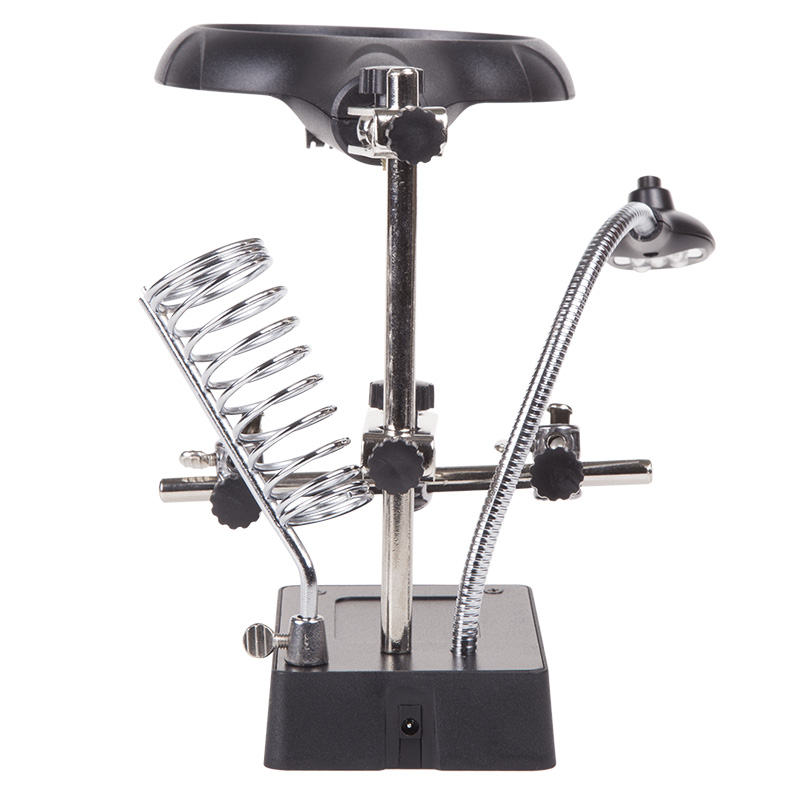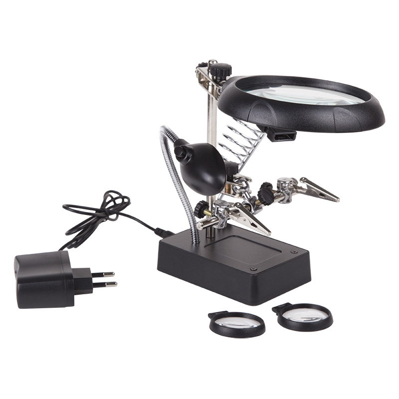 Назначение: Cлужит главным образом при проведении паяльно-сборочных работ в электронике, ювелирном деле, сборке и ремонте для зажима мелких деталей в любом нужном положении, когда не хватает двух рук. Инструмент состоит из основания (подставка), шарнирного соединения с зажимами типа «крокодил» (подвижных во всех плоскостях, с никелевым покрытием), двух луп с кратностью увеличения 2.5(диам.90мм) и 7.5(диам.34мм), а также модуля подсветки. В данной модели реализована подсветка от двух альтернативных источников: Батарей (не поставляются в комплекте) и блока питания (в комплекте). С помощью лупы можно будет рассмотреть даже самые мелкие детали.