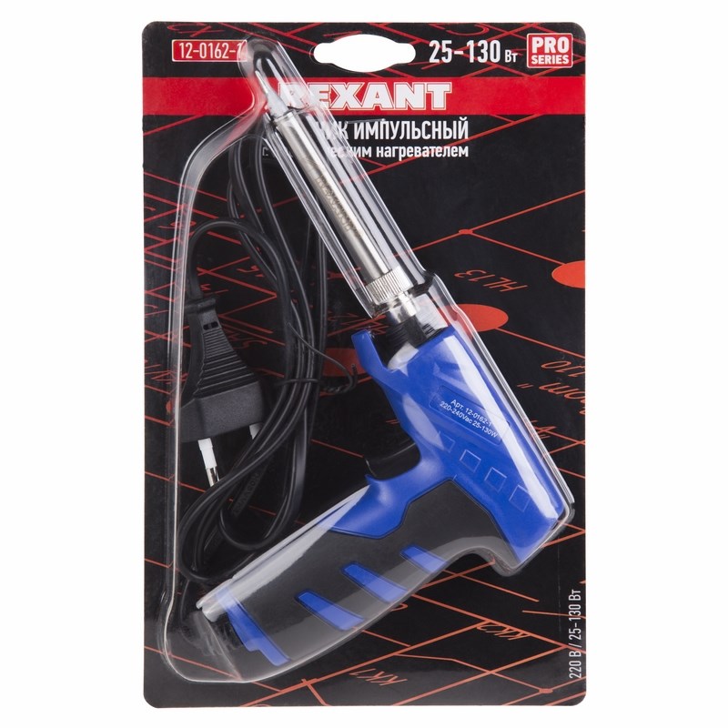 Назначение: Для ручного монтажа радиоэлементов. Он используется для пайки электродеталей в двух мощностных режимах: 25 Вт и 130 Вт. Особенность данного инструмента заключается в том, что максимальная мощность и ускоренный разогрев активируются нажатием и удержанием курка. Это позволяет оператору сначала установить жало инструмента в определенную точку пайки, а затем нажатием кнопки на корпусе перевести паяльник в максимальный рабочий режим. Паяльник выполнен с керамическим нагревательным элементом и индикатором включения в форме пистолета и имеет очень удобную эргономичную рукоятку из ударопрочного пластика с резиновыми вставками. Характеризуется экономичным энергопотреблением.Длина провода: 1,35 м. Удобен для распайки кабелей в шкафах, а также быстрых демонтажных работ.
