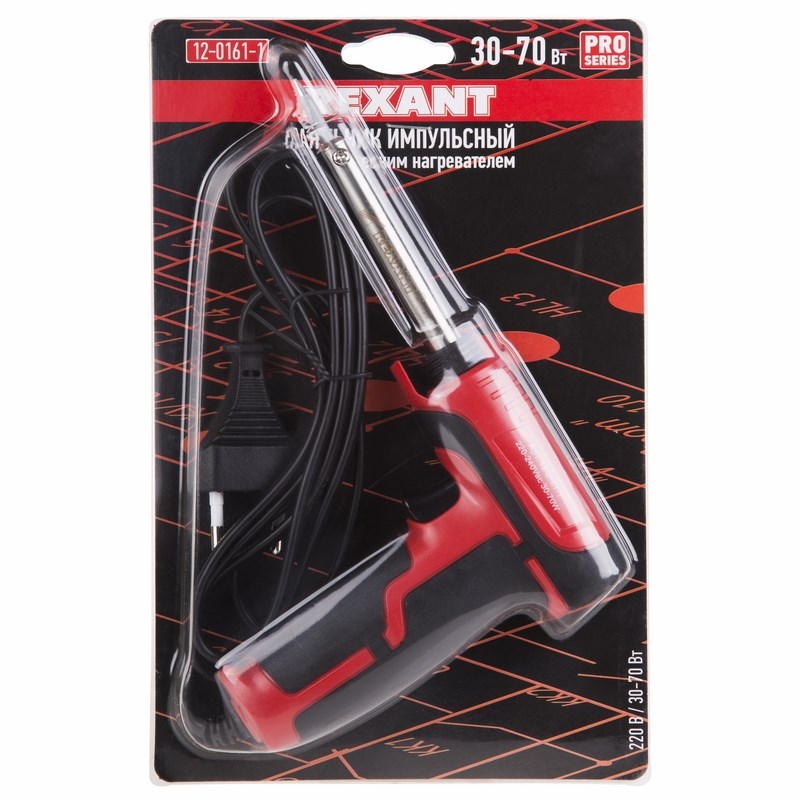 Назначение: Для ручного монтажа радиоэлементов. Он используется для пайки электродеталей в двух мощностных режимах: 30 Вт и 70 Вт. Особенность данного инструмента заключается в том, что максимальная мощность и ускоренный разогрев активируются нажатием и удержанием курка. Это позволяет оператору сначала установить жало инструмента в определенную точку пайки, а затем нажатием кнопки на корпусе перевести паяльник в максимальный рабочий режим. Паяльник выполнен с керамическим нагревательным элементом и индикатором включения в форме пистолета и имеет очень удобную эргономичную рукоятку из пластика с резиновыми вставками. Характеризуется экономичным энергопотреблением.Длина провода: 1,35 м. Удобен для распайки кабелей в шкафах, а также быстрых демонтажных работ.