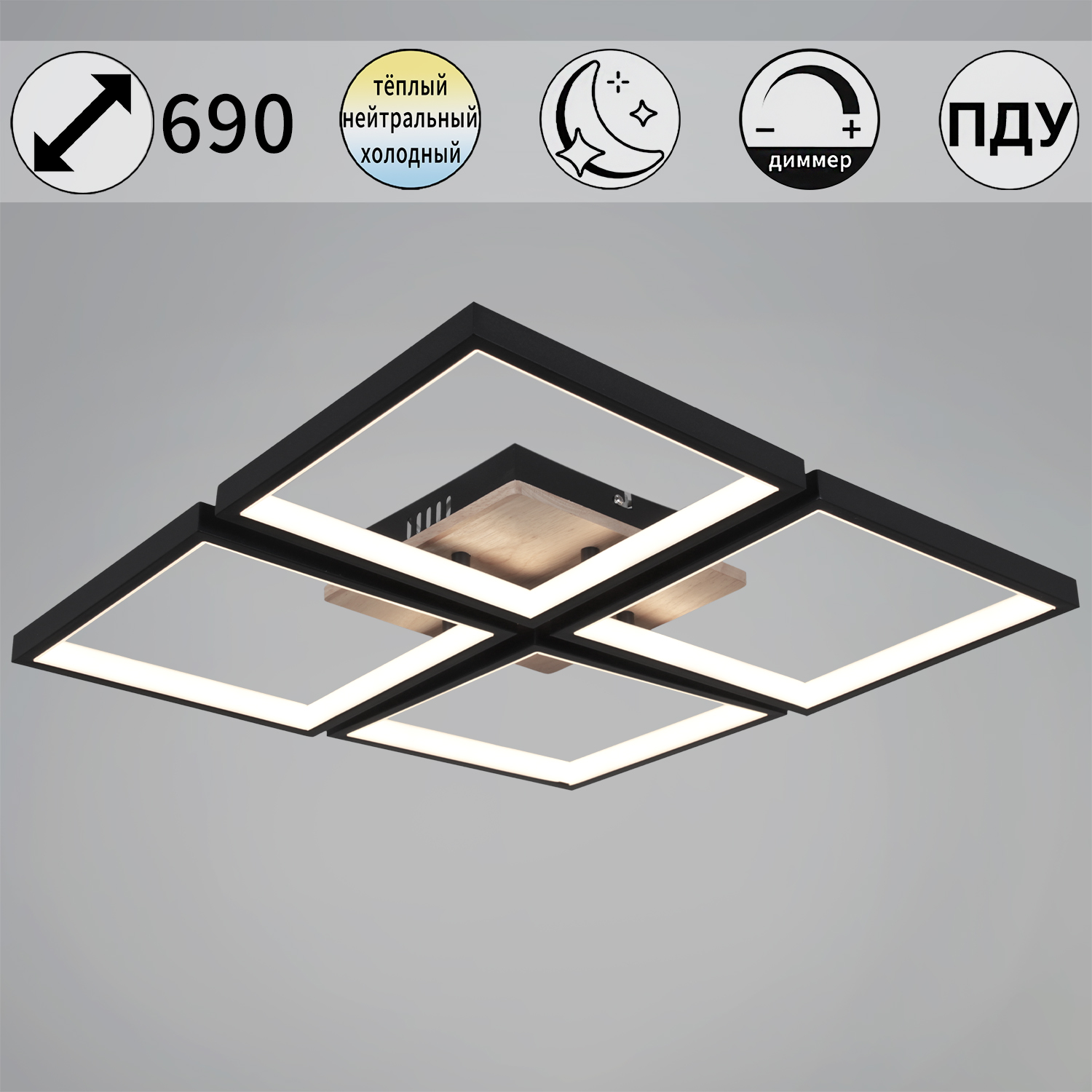 Светильник светодиодный "Reluce" 78560-0.3-0.4 BK+WOOD LED 136W чёрный/дерево 3000/6000K d/70*690*490*490 Диммируется от тёплого к холодному Пульт в комплекте Площадь 24кв.м.