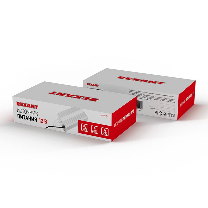 Трансформатор "REXANT" 12V 200Вт IP67 16,7А с проводами,влагозащищенный (размер: 238х130х60)