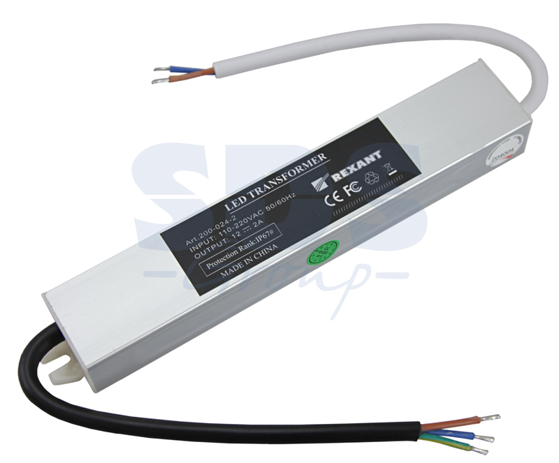 Трансформатор "REXANT" 24V 24W IP67 тонкий с проводами, влагозащищенный (размер: 20,5*35*35)