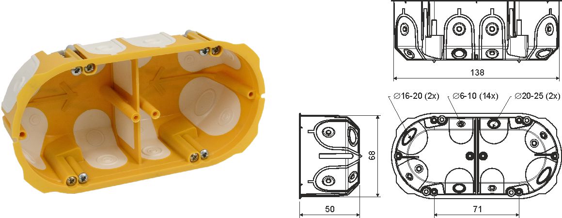 Диаметр 68мм, глубина 50мм, длина 138мм.