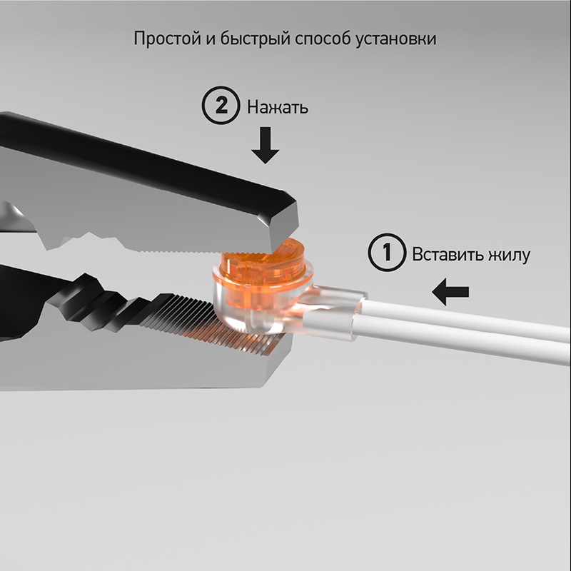 Внутри красной кнопки есть контактная пластина, которая при нажатии на все ту же кнопку, прорезает провода и тем самым соединяет их. Как только обжим выполнен — контакты сразу же защищаются гидрофобным (влагоотталкивающим) гелем, находящимся внутри пластикового корпуса, который, в свою очередь, защищает сращиваемые контакты на весь срок службы электромонтажной системы.