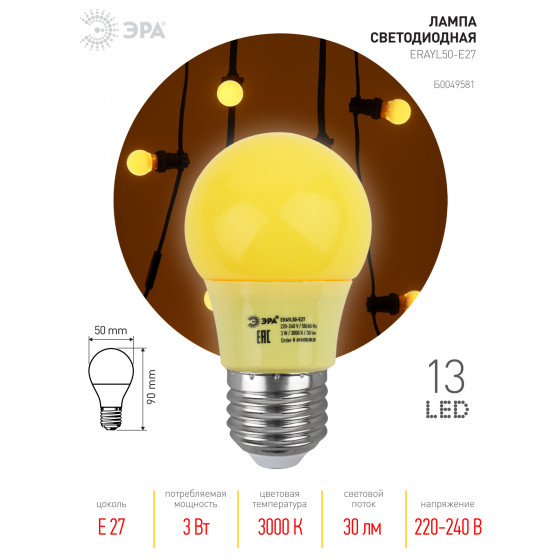 Лампа светодиодная "ЭРА" ERAYL50-E27 для гирлянды-конструктора "Белт-лайт" груша E27 3Вт 10lm 3000K жёлтый