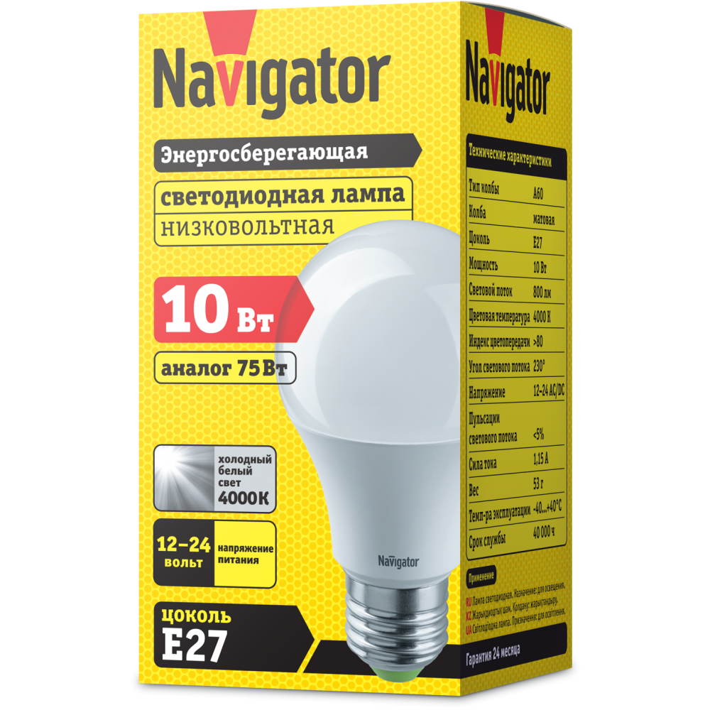 Лампа светодиодная "Navigator" 61 478 груша Е27 24/48V 12Вт 1000lm 4000К