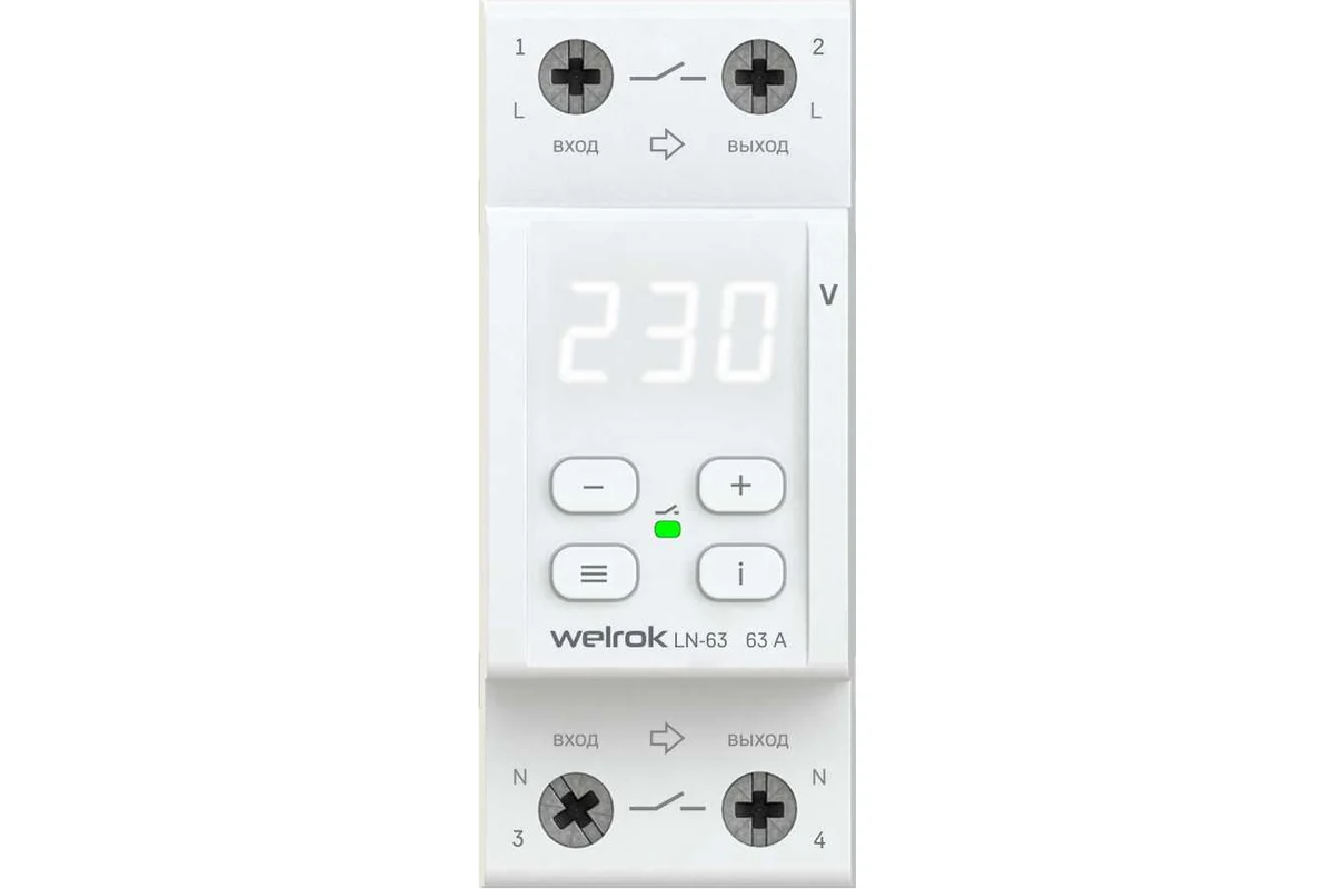 Реле напряжения "WELROK" LN-63 (1-фазное, 63А, РАЗРЫВ ФАЗЫ И НЕЙТРАЛИ, белый дисплей)