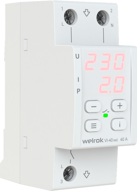 Реле напряжения "WELROK" VI-40 red (1-фазное, 40А, контроль тока и мощности, красный дисплей)