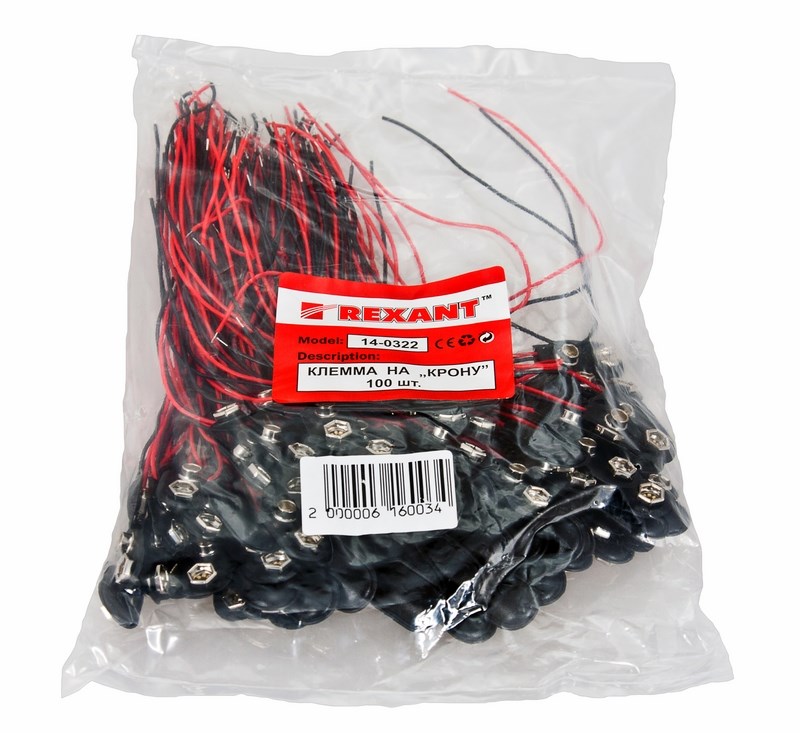 Назначение: Для подключения питания к измерительному инструменту, различным пультам дистанционного управления, бытовым устройствам (радиоприемники, телефонные аппараты), радиоуправляемым моделям и другой электротехнике, имеющей совместимые по форме контакты типа "Крона". Клемма состоит из контактной группы и двух изолированных многожильных проводов длиной 15 см, подготовленных (окончания зачищены и облужены оловом) к использованию. Сечение жилы проводника составляет 0.3 мм. Особенность угловой клеммы заключается в том, что для удобства эксплуатации провода подходят к середине контактной группы.
