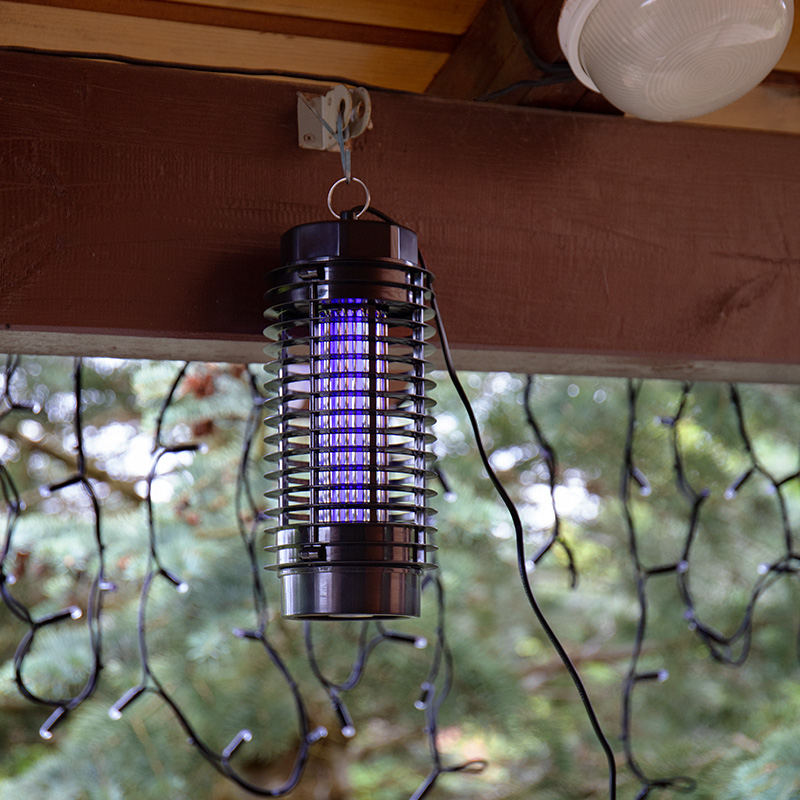 Принцип действия электрического уничтожителя насекомых (комаров, мошкары) - основан на использовании ультрафиолетового излучения в специальном диапазоне (350-400 нм). Многие летающие насекомые весьма чувствительны к данному диапазону УФ-излучения и он привлекает их. Подлетая к лампе, насекомые замыкают собой прутья металлической решетки под напряжением и погибают от электрического разряда. Погибшие насекомые падают на поддон, откуда их легко удалить.