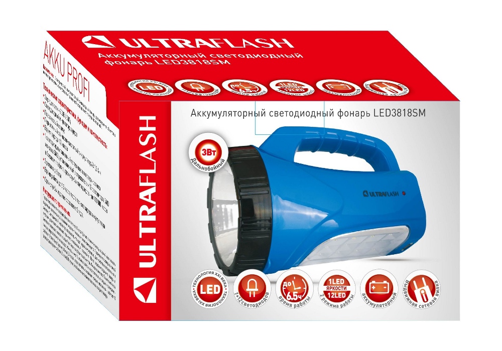 Фонарь "Ultraflash" LED3818SM аккумуляторный (1 + 12 LED, аккумулятор 4 вольт 1,3 А*ч, дистанция освещения - до 40 м, время работы до 6,5 ч.)