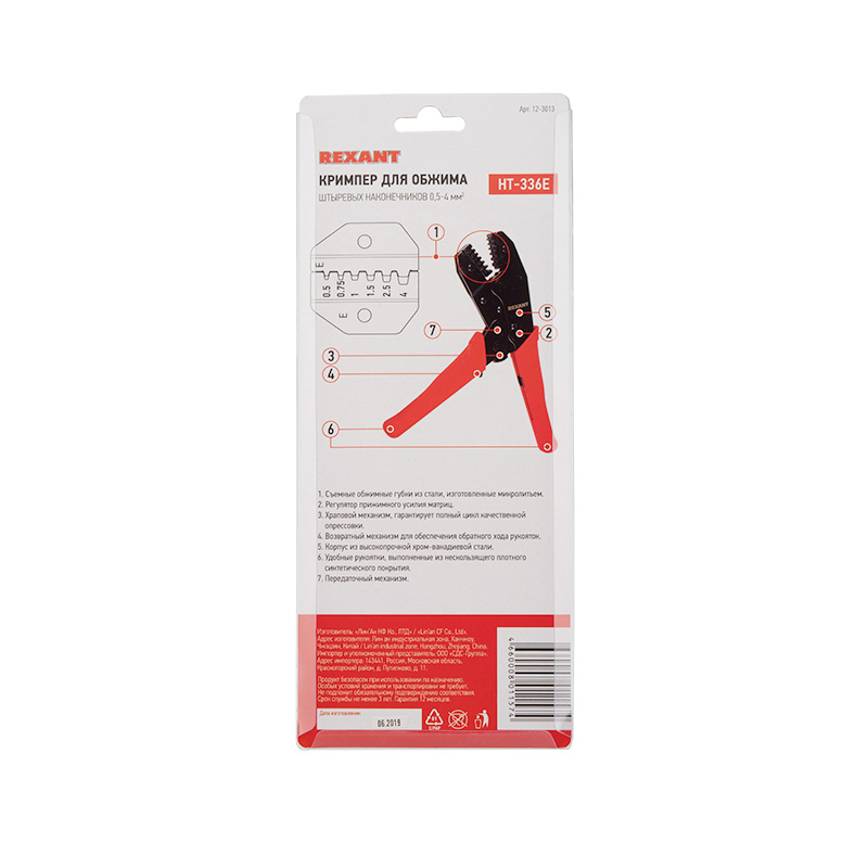 Кримпер REXANT HT-301 E для обжима штыревых наконечников предназначен для обжима неизолированных автоклемм 0.5-4.0 мм².