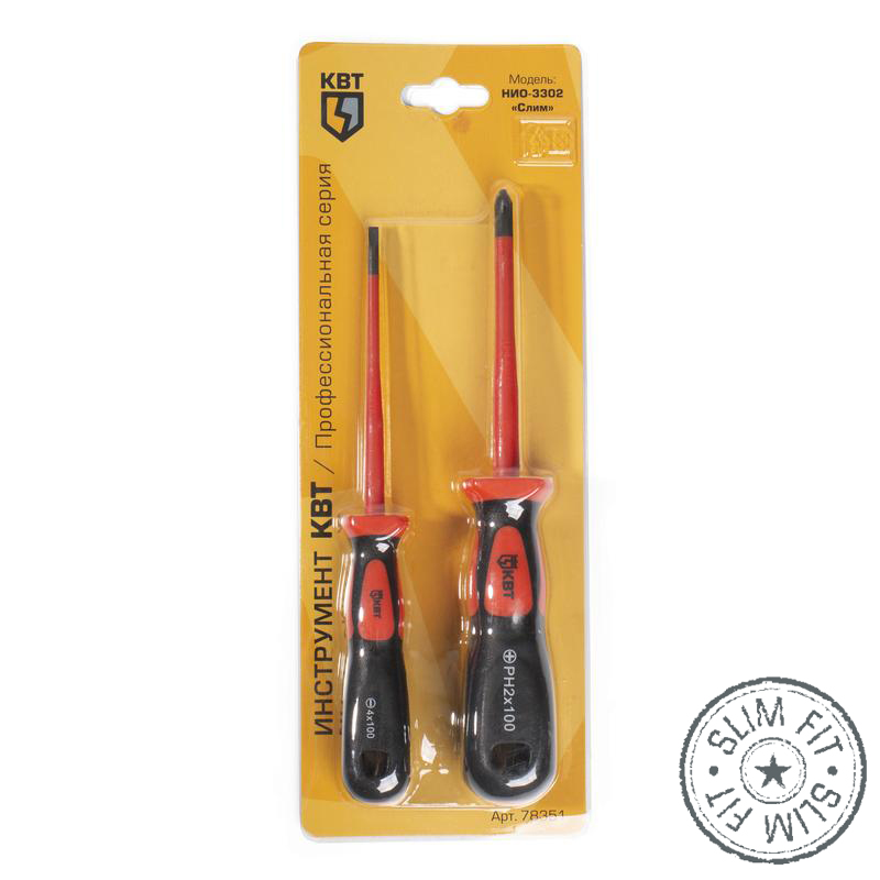 Набор диэлектрических отверток "КВТ" НИО-3302 "Слим" с профилями шлиц и крест (для работ под напряжением до 1000 В)