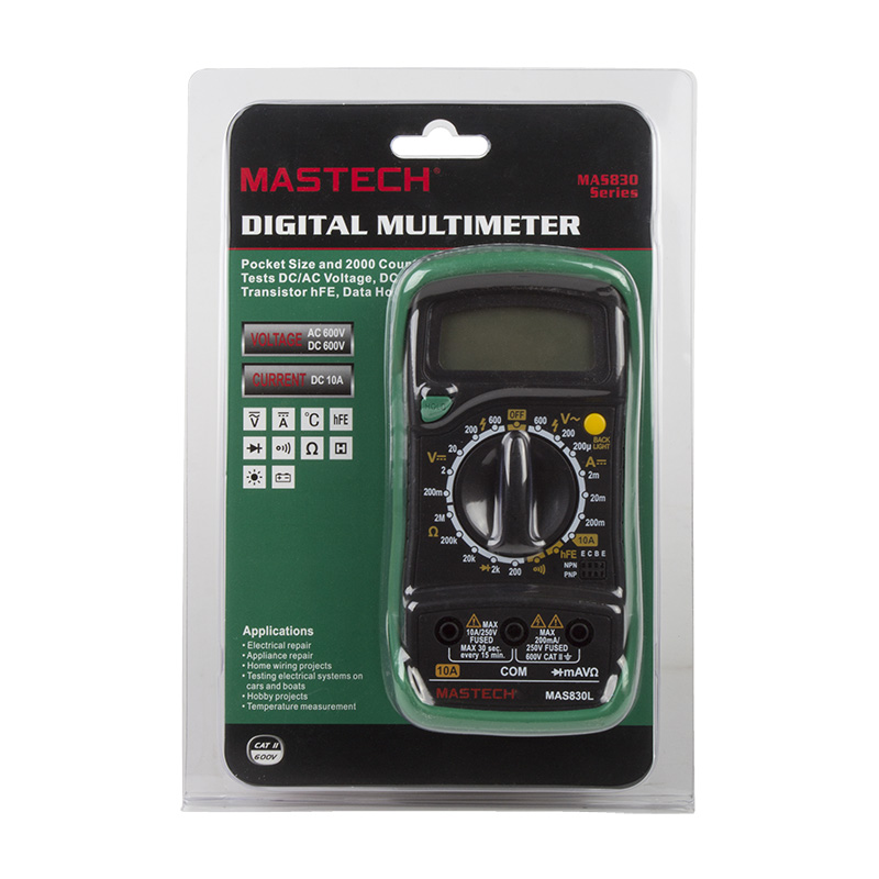 Мульти́метр — электроизмерительный прибор, которыйизмеряют постоянное и переменное напряжение, постоянный ток и сопротивление в цепи,позволяет проводить тестирование диодов и прозвонку целостности цепи.Прибор MAS830L является портативным мультиметром, обладает широким функционалом ,выгодно отличающих его от других.