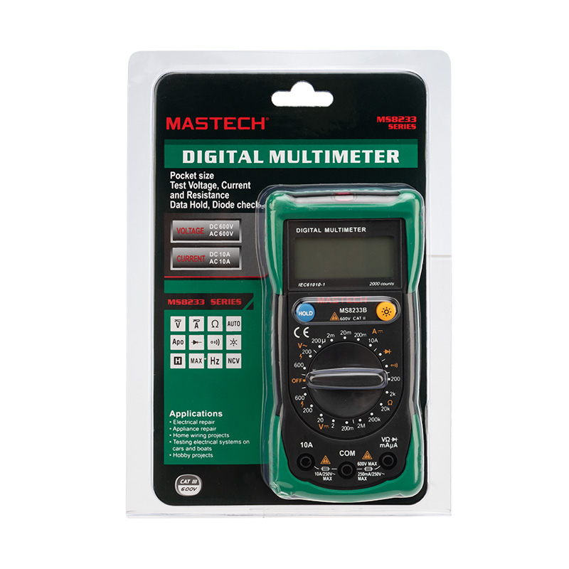 Назначение: приборы серии MS8233 измеряют постоянное и переменное напряжение, а также постоянный ток и сопротивление в цепи,позволяют тестировать диоды и осуществлять прозвонку целостности цепи.MS8233B оборудован специальным датчиком, с помощью которого можно бесконтактно определить, есть ли напряжение на участке,например в розетке,при необходимости ее демонтажа, то с помощью данного прибора можно сразу узнать, если ли в ней напряжение.MS8233B является портативным мультиметром с компактными размерами.