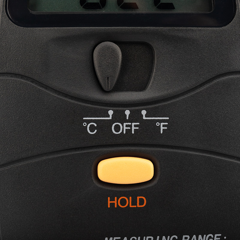 С помощью переключателя можно изменять полученные данные и измерять температуру по шкале Цельсия и по шкале Фаренгейта. Полученные данные можно сохранить с помощью функции DATA HOLD.