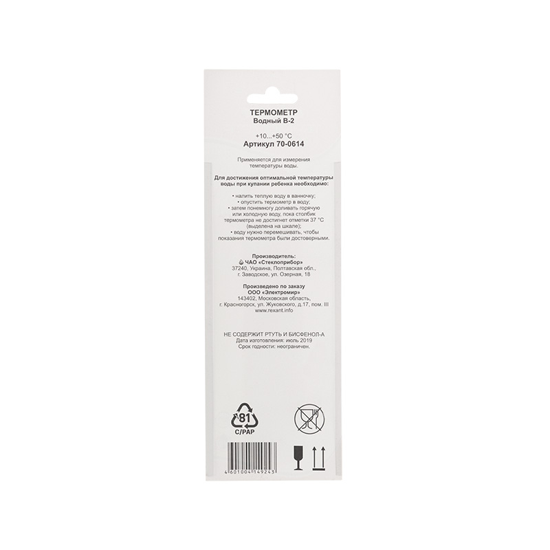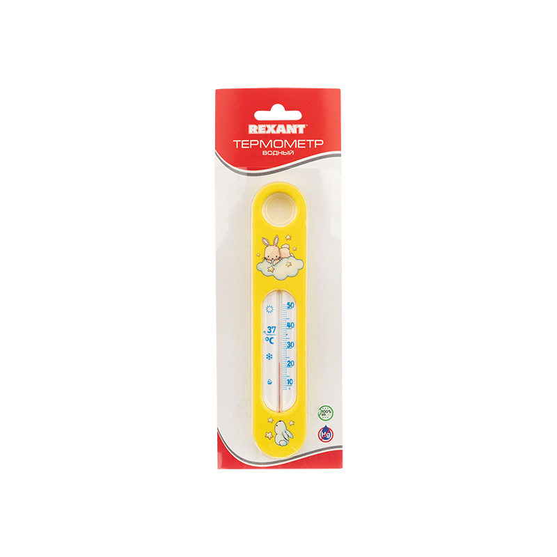 Водный термометр REXANT используется для измерения температуры воды, чаще всего при купании детей. Корпус термометра выполнен из пластика и имеет прямоугольную форму с закругленными краями, а колба изготовлена из ударопрочного стекла. Модель имеет наглядную шкалу с ценой деления в 1 °С и широкий диапазон температур +10…+50 °С. На термометре есть отметка 37 °С — оптимальная температура купания ребенка.