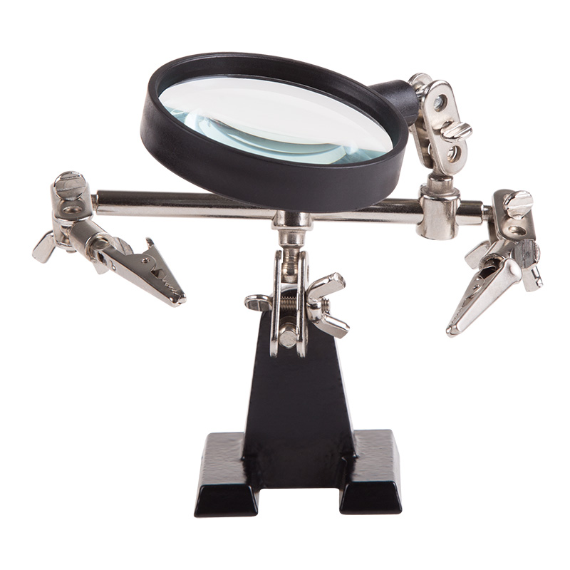 Назначение: Для проведении паяльных работ в электронике, ювелирном деле, сборке и ремонте для зажима мелких деталей в любом нужном положении, когда не хватает двух рук. Инструмент состоит из чугунного основания (тяжелая подставка), шарнирного соединения с зажимами типа «крокодил» (подвижных во всех плоскостях) с никелевым покрытием и лупы с 2.5 кратным увеличением (возможность регулировки положения, диаметр линзы 60мм).