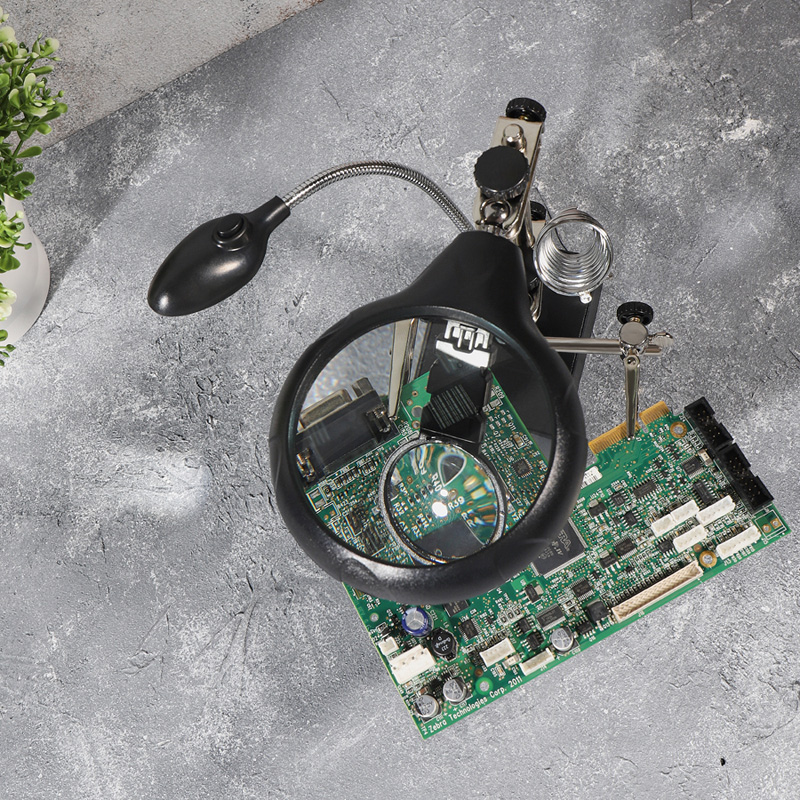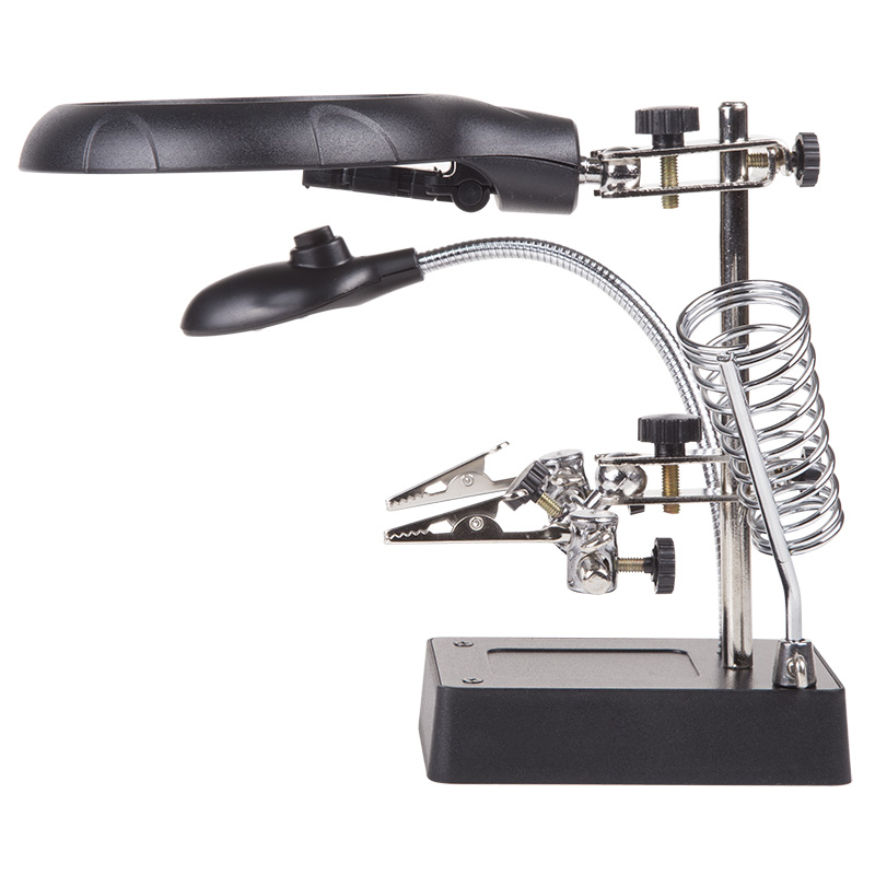 Назначение: Cлужит главным образом при проведении паяльно-сборочных работ в электронике, ювелирном деле, сборке и ремонте для зажима мелких деталей в любом нужном положении, когда не хватает двух рук. Инструмент состоит из основания (подставка), шарнирного соединения с зажимами типа «крокодил» (подвижных во всех плоскостях, с никелевым покрытием), двух луп с кратностью увеличения 2.5(диам.90мм) и 7.5(диам.34мм), а также модуля подсветки. В данной модели реализована подсветка от двух альтернативных источников: Батарей (не поставляются в комплекте) и блока питания (в комплекте). С помощью лупы можно будет рассмотреть даже самые мелкие детали.
