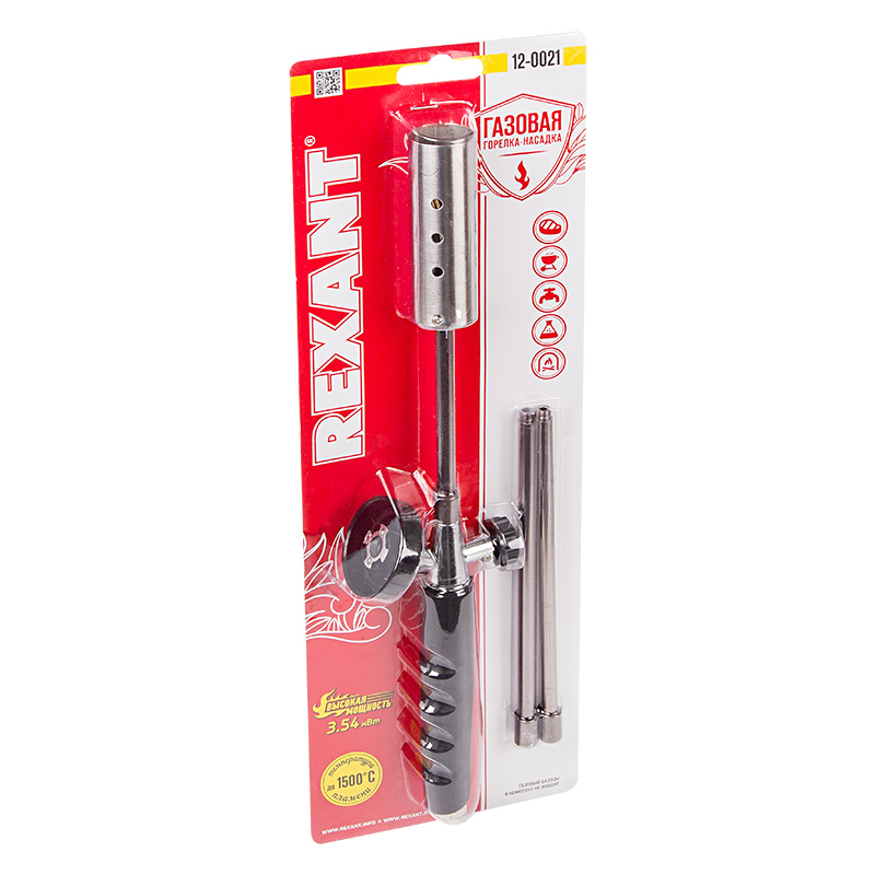 Газовая горелка-насадка REXANT GT-21. Горелка с широким соплом, повышенной мощностью и уникальной конструкцией, позволяющей выбрать необходимую для работы длину из трех вариантов — 395 мм, 590 мм и 785 мм. Не имеет аналогов на российском рынке. Отлично подойдет для пользователей, которые нуждаются в приложении максимальной энергии на обрабатываемый участок, который может находиться на удалении, куда не дотянется любая стандартная горелка. Пластиковая рукоять в холодное время года будет приятнее удержания обычным способом «за баллон». Может использоваться для работы с термоусаживаемыми трубками, перчатками, муфтами; для плавления и сварки изделий из пластиков и стекла и т.д.