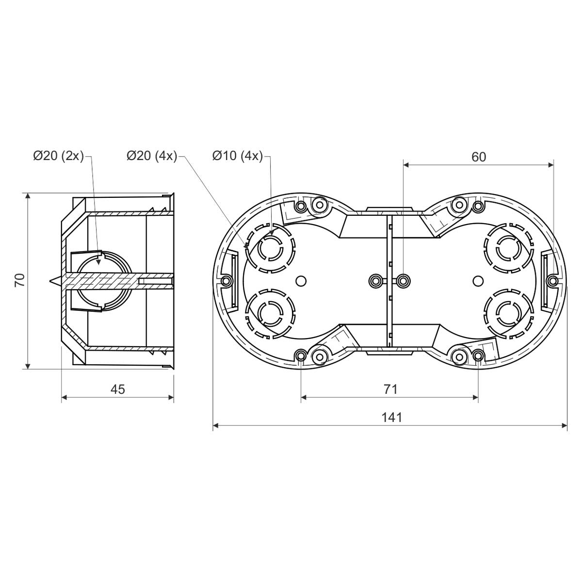 Коробка для многоместных рамок. Повышенная прочность упрощает установку приборов. На внешней стороне четыре шипа для пометки центра сверления. Монтажные винты имеют трёхшаговую резьбу для быстрого монтажа.