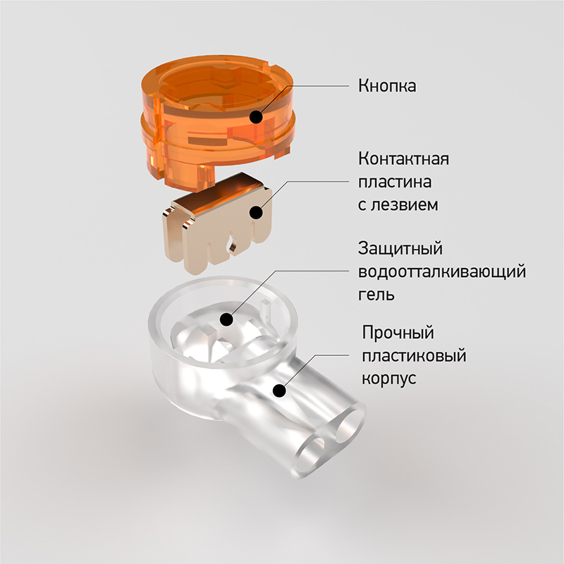 Внутри красной кнопки есть контактная пластина, которая при нажатии на все ту же кнопку, прорезает провода и тем самым соединяет их. Как только обжим выполнен — контакты сразу же защищаются гидрофобным (влагоотталкивающим) гелем, находящимся внутри пластикового корпуса, который, в свою очередь, защищает сращиваемые контакты на весь срок службы электромонтажной системы.