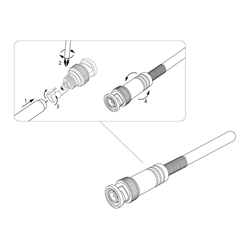 Назначение: Для подключения коаксиального кабеля c волновым сопротивлением 50 и 75 Ом, диаметром до 7мм, к видеокамерам, видеорегистраторам, мониторам и другим радиоэлектронным устройствам. BNC-коннектор (BNC сокр. от Bayonet Neill Concelman) под винт - электрический разъем с байонетной фиксацией закрепляется на кабеле зажимом с помощью винта центрального контакта (центральная жила - под винт, оплетка - обжимается). Этот способ крепления значительно проще и быстрее, чем пайка, но его надежность и качество соединения остаются на неизменно высоком уровне. Металлический колпачок с пружиной защищает соединения и предотвращает кабель от перегиба в месте крепления к разъему. BNC-разъем изготовлен из материалов: