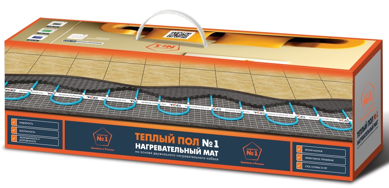 Теплый пол №1(марка ТСП) это тонкий (диаметр 3,5 мм) нагревательный мат, который представляет собой нагревательный кабель, закрепленный на несущей стеклосетке шириной 50 см. Нагревательные маты представляют собой готовую конструкцию, исключающую процедуру укладки и крепления нагревательного кабеля, поэтому их монтаж черезвычайно прост.